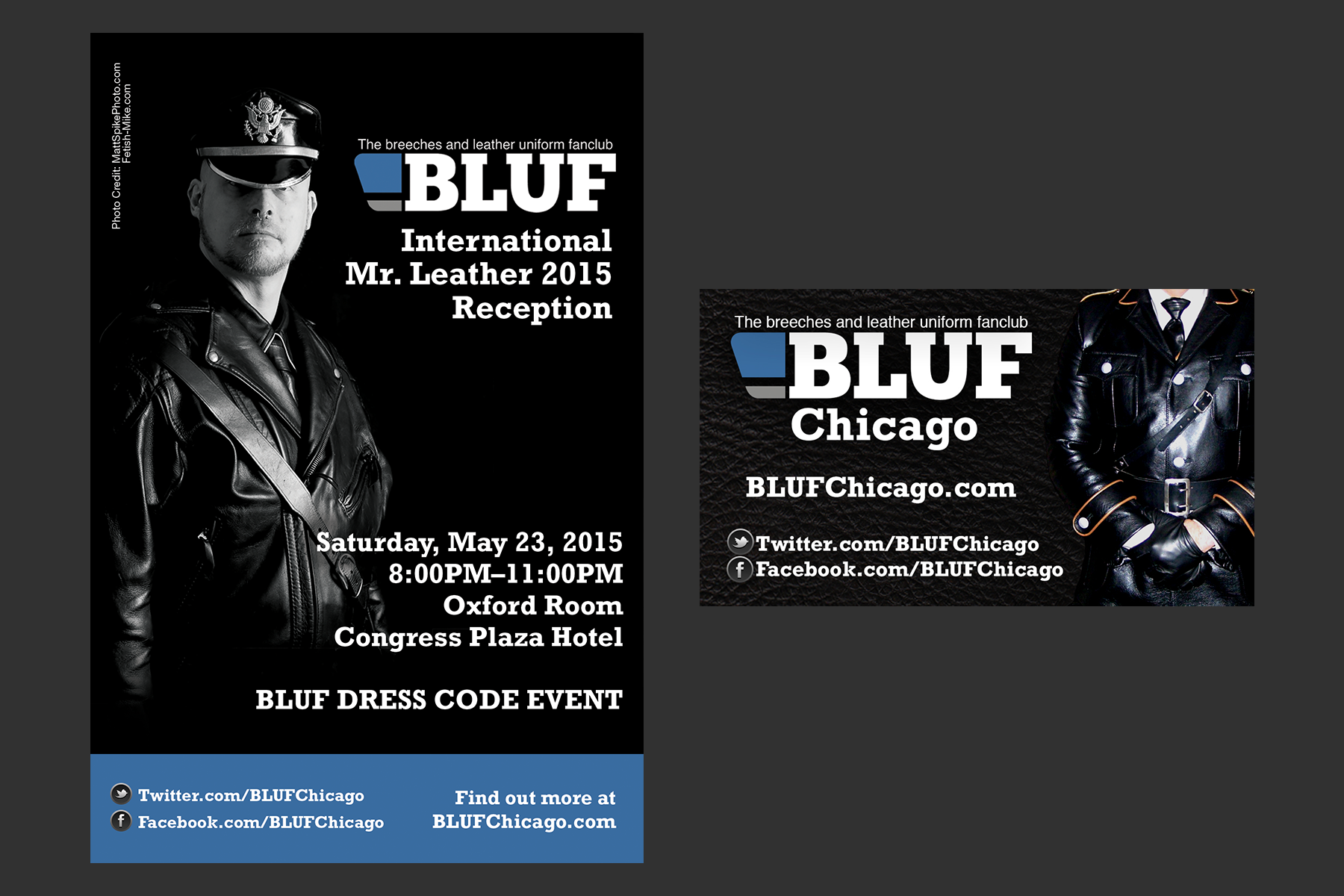 Set of posters, cards and postcards created for the Breeches and Leather Uniform Fanclub, Chicago Chapter, a group of leathermen that organizes gatherings for people who share the passion for leather uniforms.